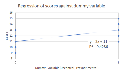 Testing the correlation between treatment and scoreThere is another approach to the question whether the treatment improved the memory of our subjects compared to a control. We lay the data out as in Table 3, where there is a dummy variable, "EvsC", which codes whether the case and the score belongs to the experimental group, EvsC = 1, or to the control group, EvsC = 0. Note that the coding here could be any two distinct values such as 1 and 2; but choosing to code the baseline (control) as 0 and the treatment as 1 has benefits when the results are interpreted. Table 3. Memory scores for experimental and control subjects.